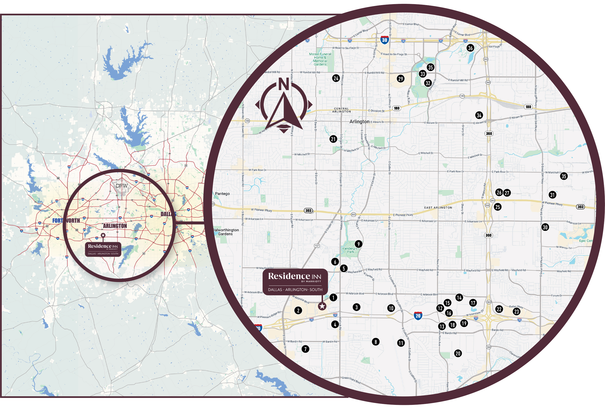 The Residence Inn boasts a premier location in the heart of Arlington, Texas, a thriving city centrally positioned between Dallas and Fort Worth. The Hotel offers immediate access to I-20 and Highway 360, placing it amid an extremely robust industrial and corporate presence that contains over 78M SF of space, including the nearby Lockheed Martin facility and the GM Arlington Assembly Plant, along with an additional 2.7M SF under construction. The Hotel is also within minutes of top demand generators such as AT&T Stadium, Globe Life Field, Six Flags Over Texas, major retail centers like The Parks Mall and Arlington Highlands, and multiple healthcare institutions. This dynamic mix of leisure, retail, business, and healthcare demand provides the hotel with a diverse and resilient customer base, supporting consistent occupancy throughout the year and enhancing its appeal as a long-term investment asset.