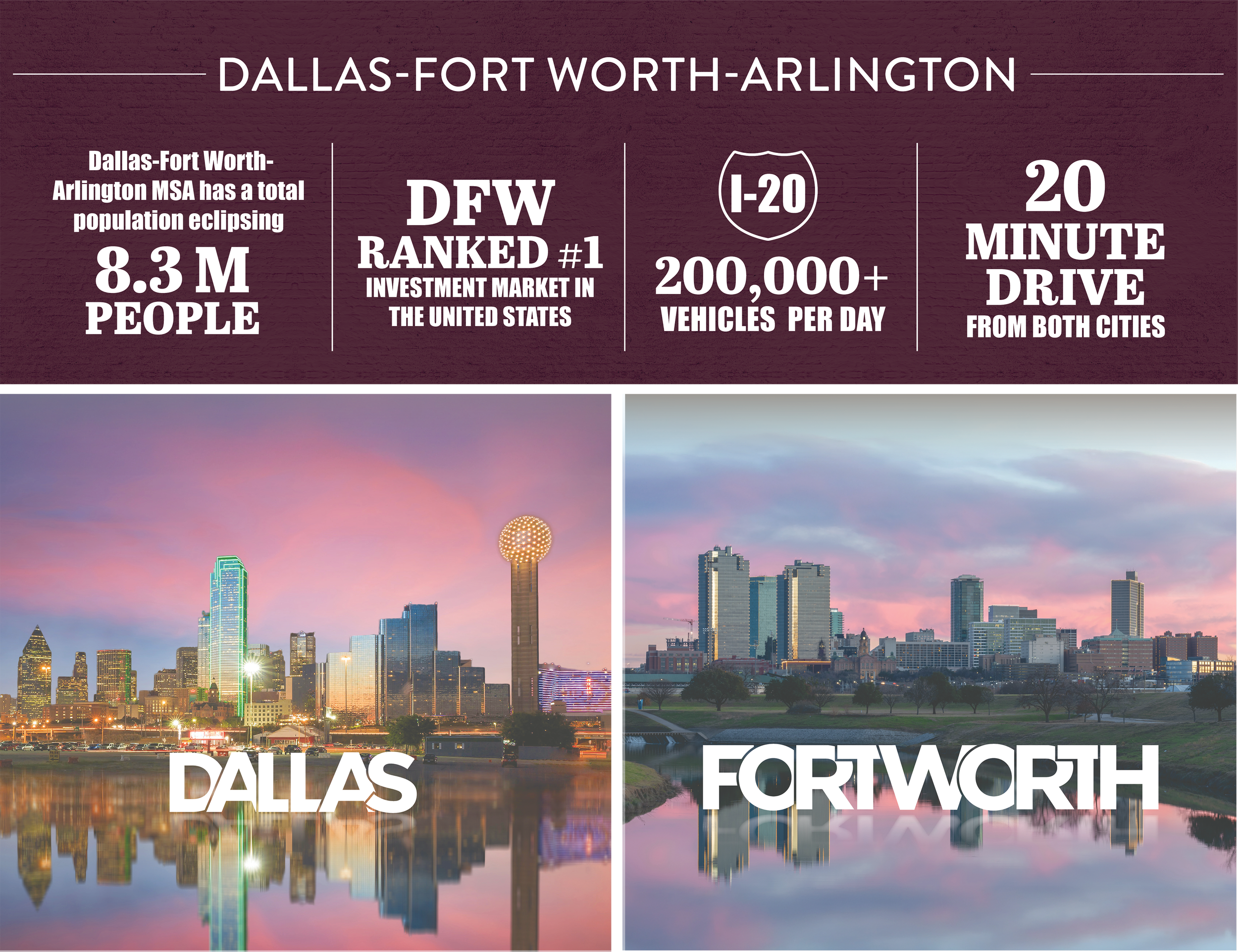 The Hotel is situated in the middle of the Dallas-Fort Worth metroplex, just off Interstate 20, and within a 20-minute drive from both cities. I-20 daily traffic volume exceeds 200,000 vehicles per day, playing a crucial role in connecting the rapidly growing population of the metroplex. As of the latest estimates, the Dallas-Fort Worth-Arlington MSA had a total population above 8.3 million people.